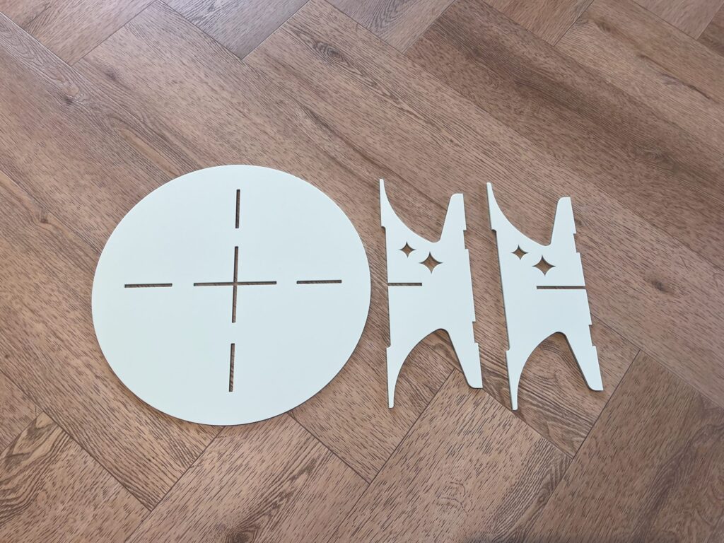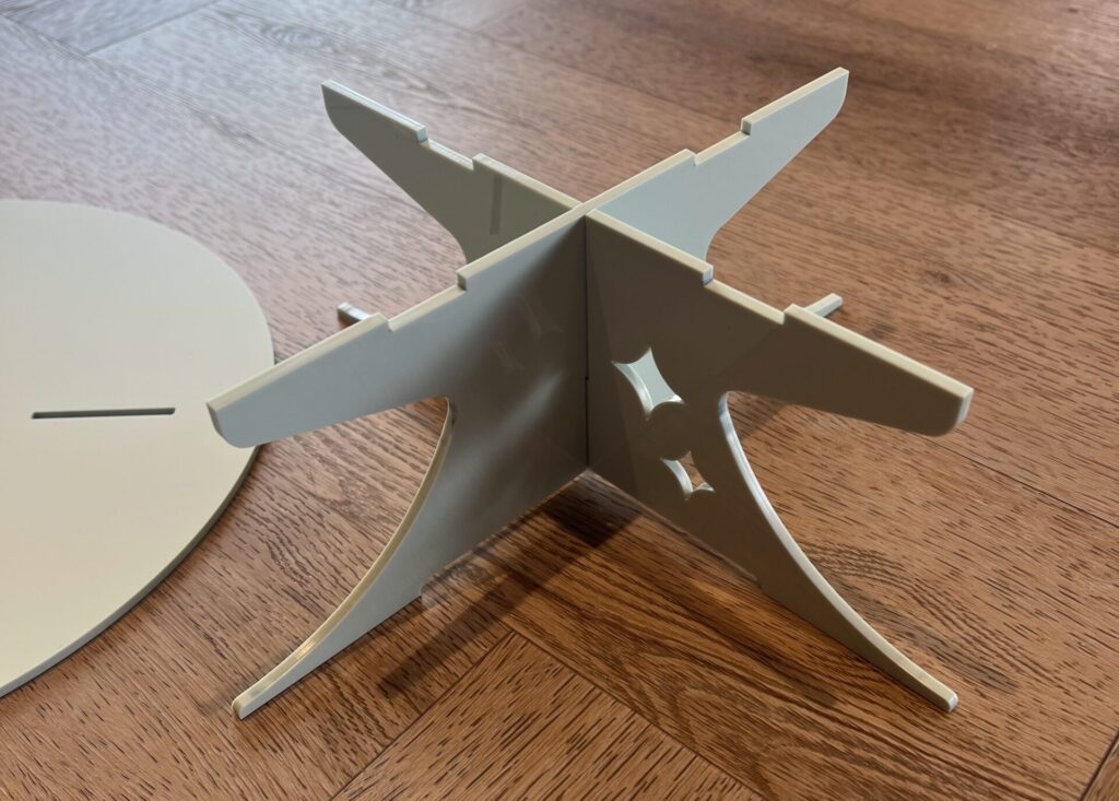Le montage d’un support à gâteaux en plexiglas est étonnamment simple. Notre support se compose de trois éléments : le plateau et les pieds de support. Il suffit d’emboîter les différentes pièces pour assembler votre support en un rien de temps. Après utilisation, vous pouvez le démonter et le ranger à plat, ce qui permet de gagner beaucoup de place.