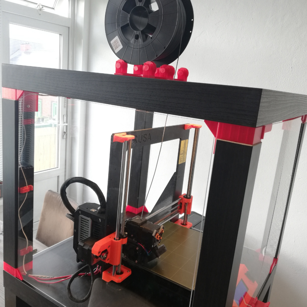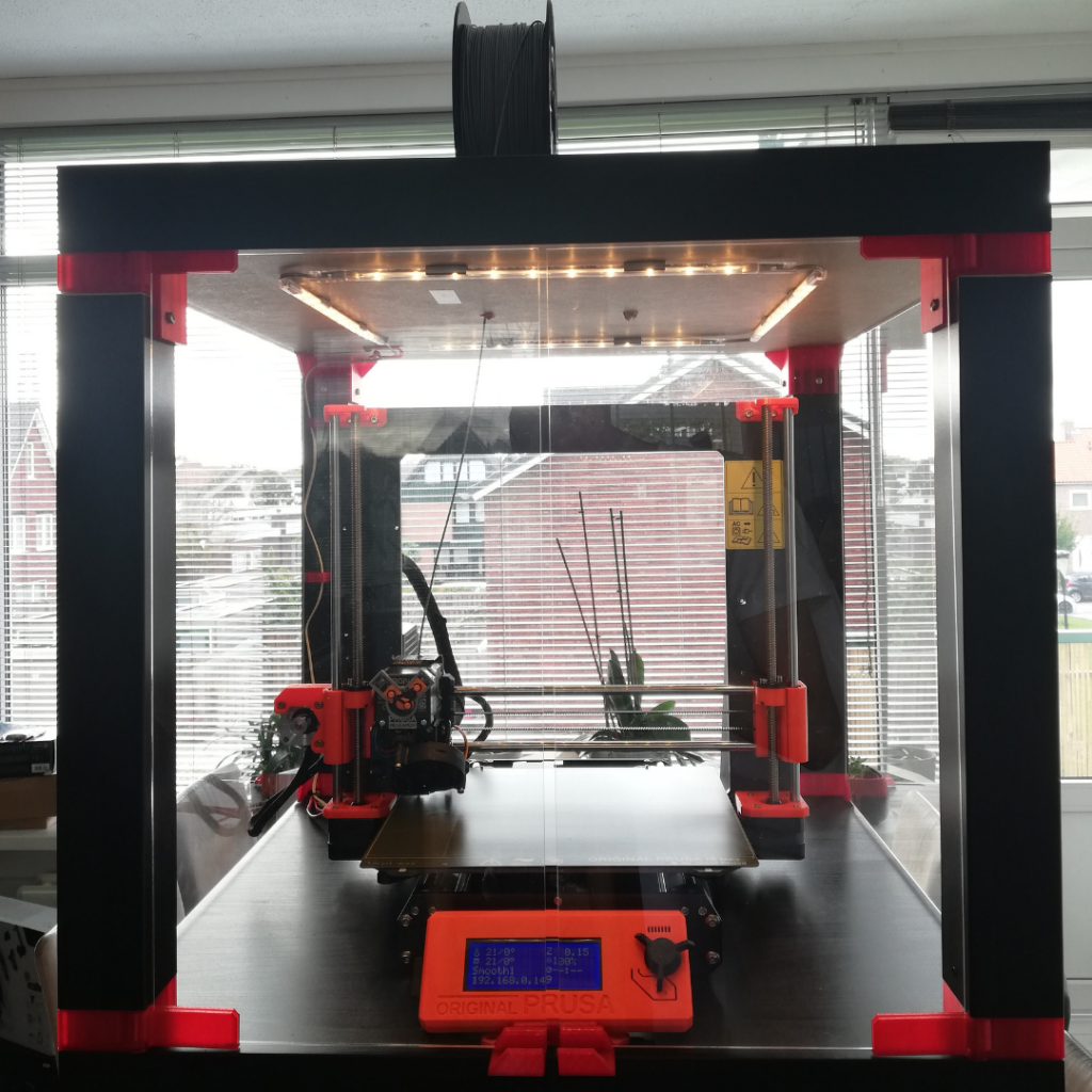 Rikus a équipé son imprimante 3D d’un boîtier bien pratique. Pour cela, il a utilisé des tables Lack d’IKEA et du plexiglass. Avec des connecteurs qu’il a imprimés lui-même, il a assemblé les tables. Il a également fixé des panneaux de plexiglass sur le boîtier. Sur le devant, de petites portes pratiques, faites de sections de plexiglass avec des charnières, permettent un accès facile. En haut de l’enceinte, il a installé un éclairage LED qui s’active au démarrage de l’imprimante. Également très pratique, il y un support pour les rouleaux de filament sur le dessus du boîtier.