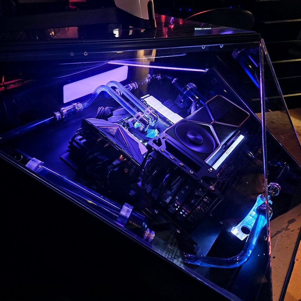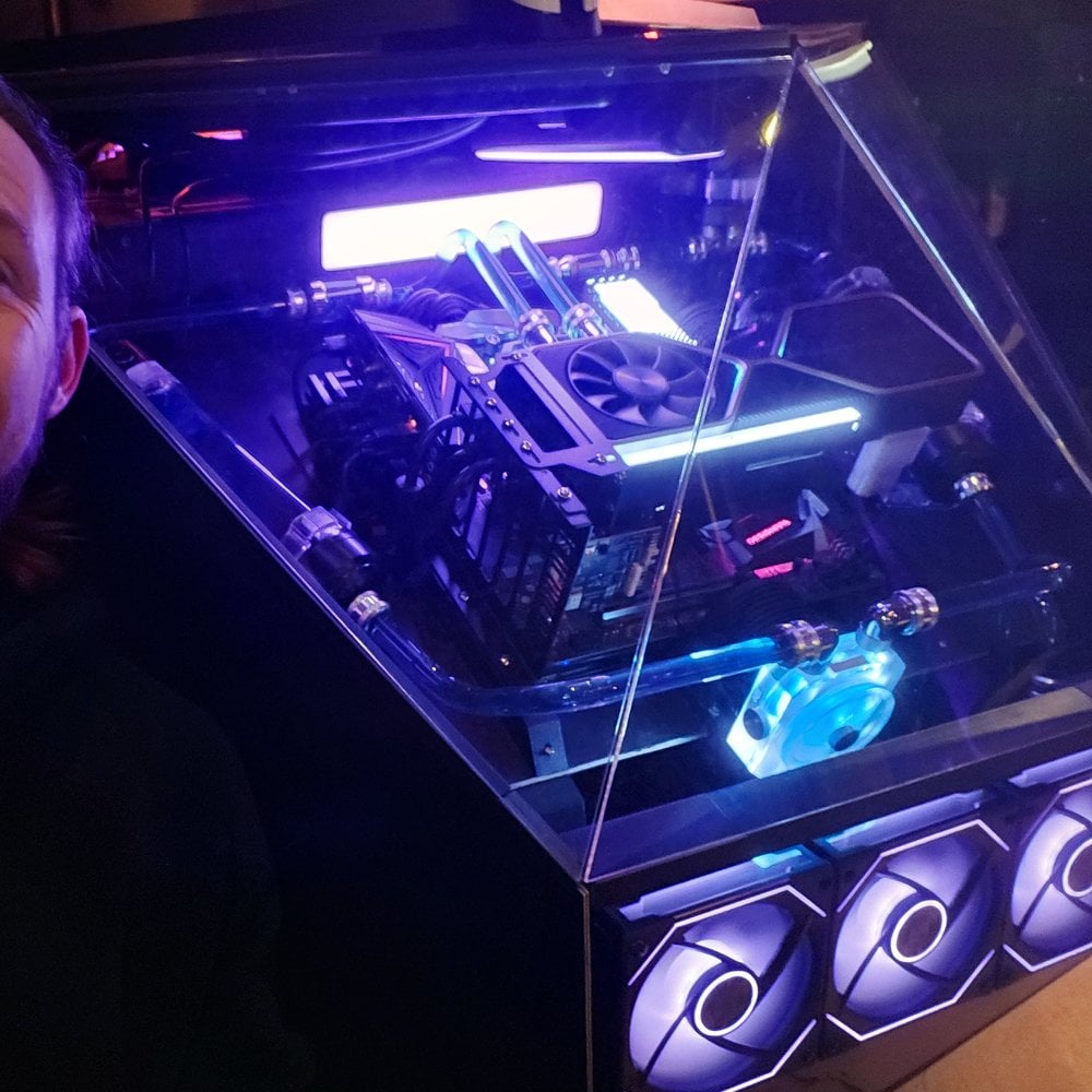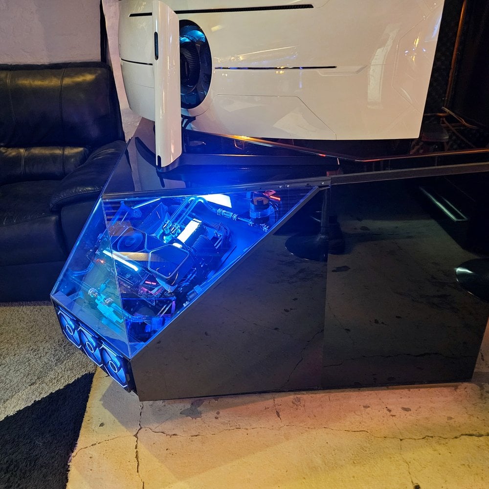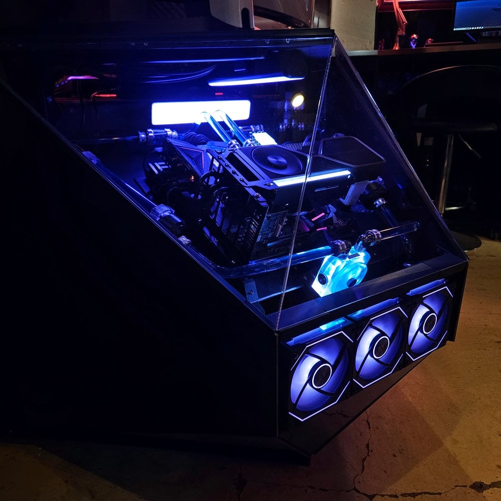 Benjamin a commencé par une structure en bois MDF à laquelle il a ajouté des pièces imprimées en 3D, des supports métalliques et de l’électronique. Le système informatique est doté d’un refroidissement liquide et d’un bouton d’alimentation externe. Mais ce qui rend ce projet vraiment unique, c’est son revêtement en aludibond et sa façade en plexiglass.