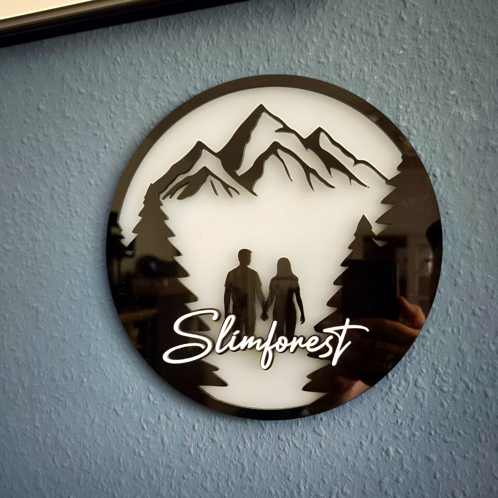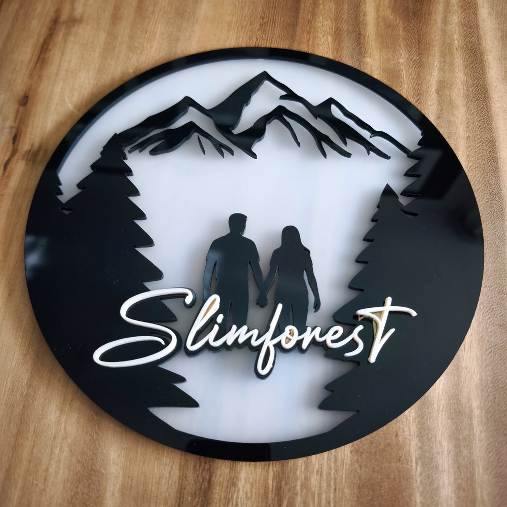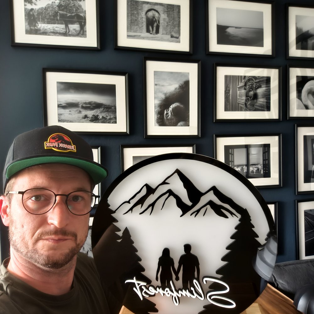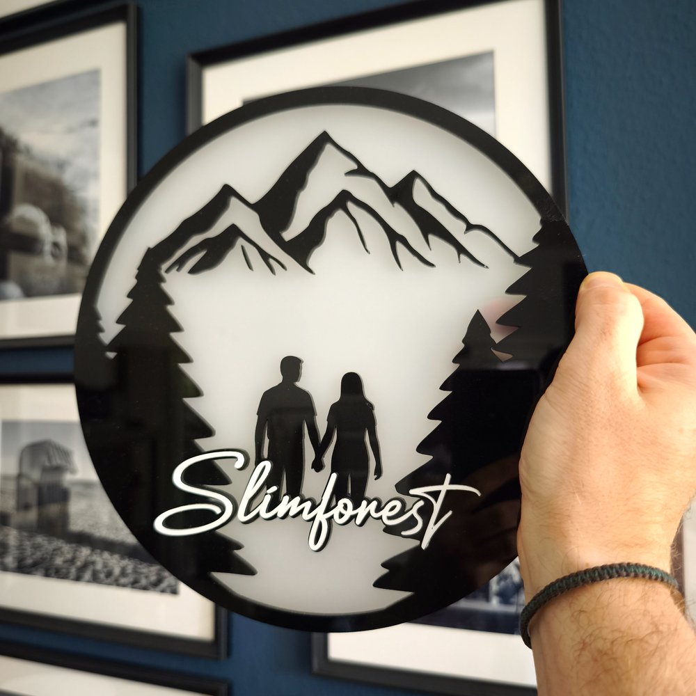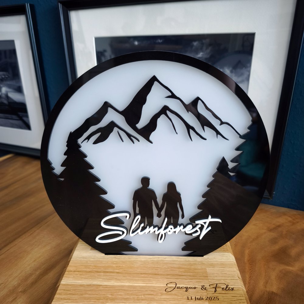 Christoph cherchait le cadeau parfait pour le mariage de ses amis, grands amateurs de randonnée. Il a imaginé un panneau mural en verre acrylique composé de trois niveaux, apportant un effet de profondeur fascinant. En cours de réalisation, il a décidé de créer également un support en chêne gravé avec les prénoms des mariés et la date du mariage. Ainsi, les heureux élus peuvent utiliser l’œuvre comme décoration murale ou la poser sur le support selon leurs envies.