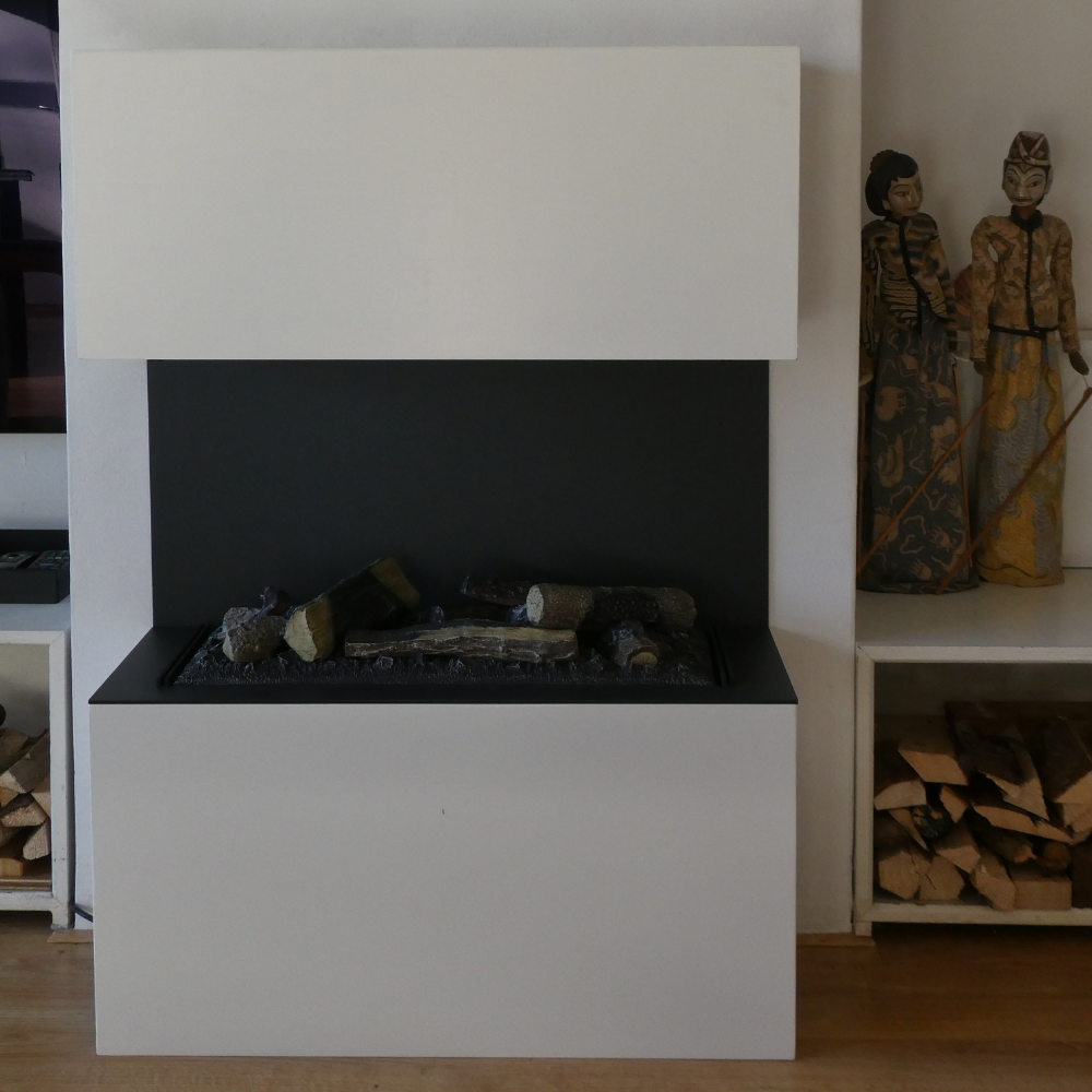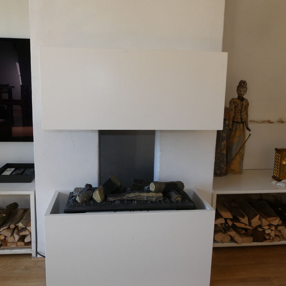 Nel a conçu et construit un foyer autour d’un poêle électrique. Ce foyer est doté de fenêtres en plexiglass. Elle a veillé à ce que l’habillage soit facile à démonter et à monter, afin qu’il soit transportable. « Nous ne voulions plus transporter de bois, alors nous avons acheté un poêle électrique. Maintenant, nous profitons du résultat grâce à la cheminée que j’ai fabriquée », dit Nel avec enthousiasme.