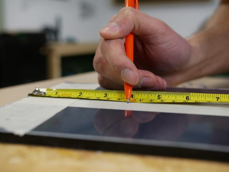 Colle du ruban adhésif de masquage sur le film protecteur du plexiglass et commence à marquer les trous de perçage pour les entretoises. Pour ce faire, perce 4 trous d’un diamètre de 10 mm dans chaque coin de la plaque. Assure-toi que la distance entre le bord de la plaque et le bord du trou de perçage est d’au moins 2 fois l’épaisseur de la plaque.