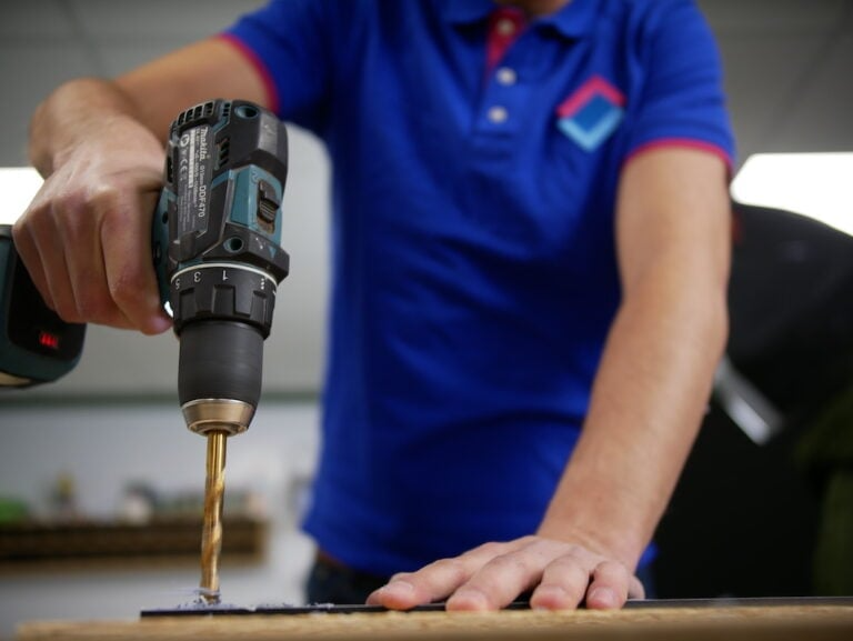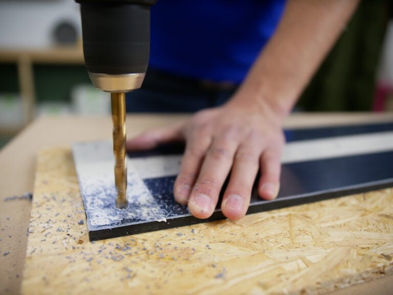 Place une plaque de bois sous le plexiglass pour éviter de percer la table ou d’autres supports. Marque ensuite les trous de perçage de tes patères. L’espace qu’il doit y avoir entre les patères dépend, entre autres, du nombre de manteaux que tu souhaites pouvoir accrocher à 1 crochet. Dans cet exemple, nous choisissons de laisser 10 cm entre les patères.