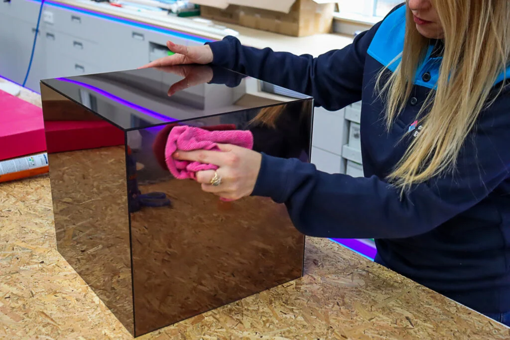 Utilisez le nettoyant antistatique Vuplex pour une surface impeccable, sans traces ni dépôts de poussière. Vaporisez une petite quantité sur un chiffon doux et effectuez des mouvements circulaires sur les miroirs. Cela permettra d’éliminer les poussières et les éventuelles traces de doigts. Résultat final: une surface brillante et sans rayure, qui attire tous les regards.