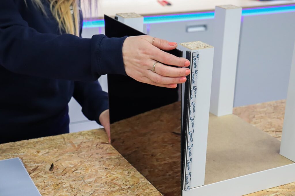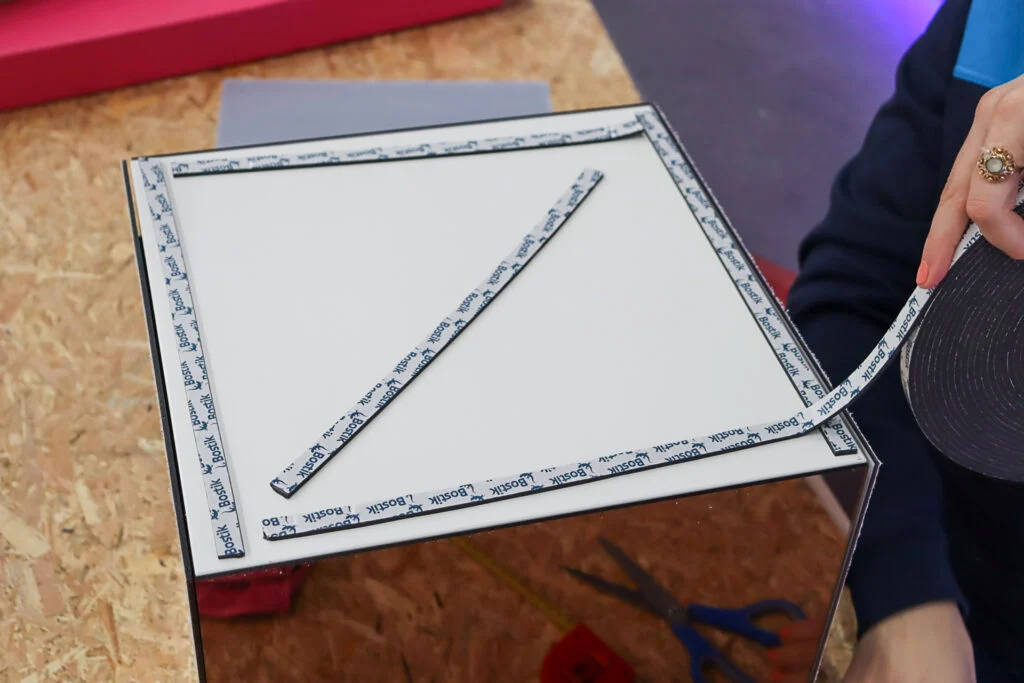 C’est l’étape où tout se concrétise: il est temps de fixer les plaques de miroir à la table. C’est à ce moment que votre projet prend vie.